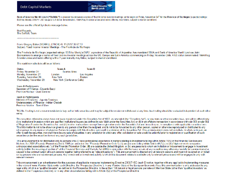 Unos 150 inversionistas se mostraron interesados en adquirir los bonos rionegrinos por U$S 300 millones. Hubo ofertas por más de U$S 1.144 millones. Gran confianza de los mercados en la propuesta rionegrina.